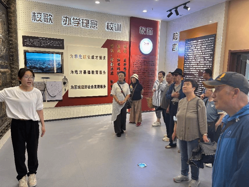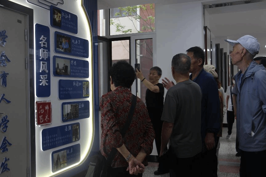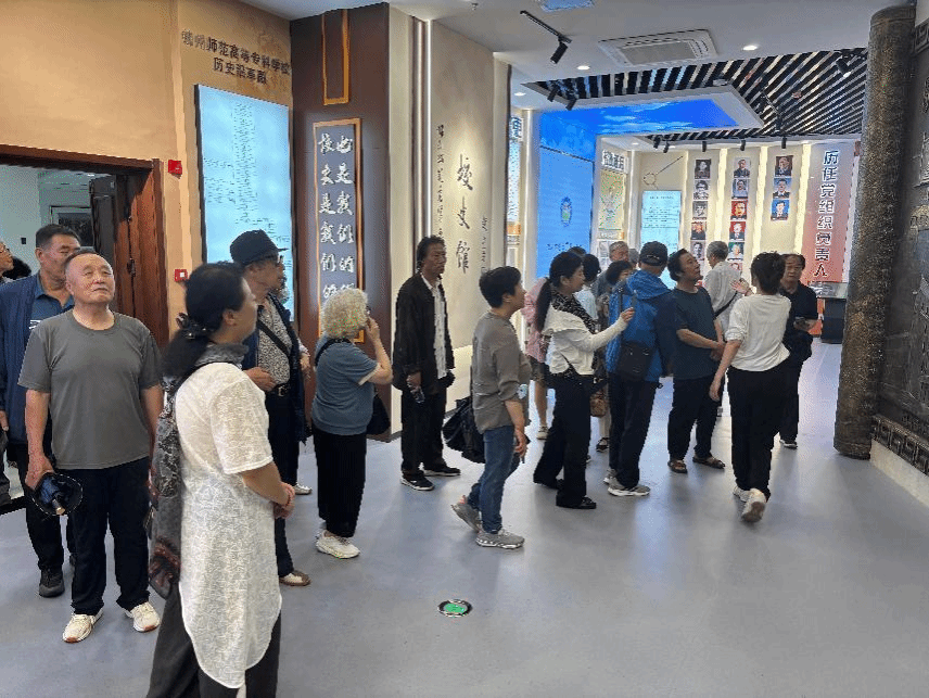 走进校史馆,志愿者学生的讲解娓娓道来,带领老教师们一同重温了学校的发展历程。一张张老照片、一件件老物件,串联起往昔岁月的点点滴滴,让大家感慨万千。而在校史馆对面的荟萃轩里,琳琅满目的书画作品散发着浓郁的翰墨书香。老教师们漫步其中,沉浸在艺术的海洋里,感受着学校深厚的文化底蕴。
