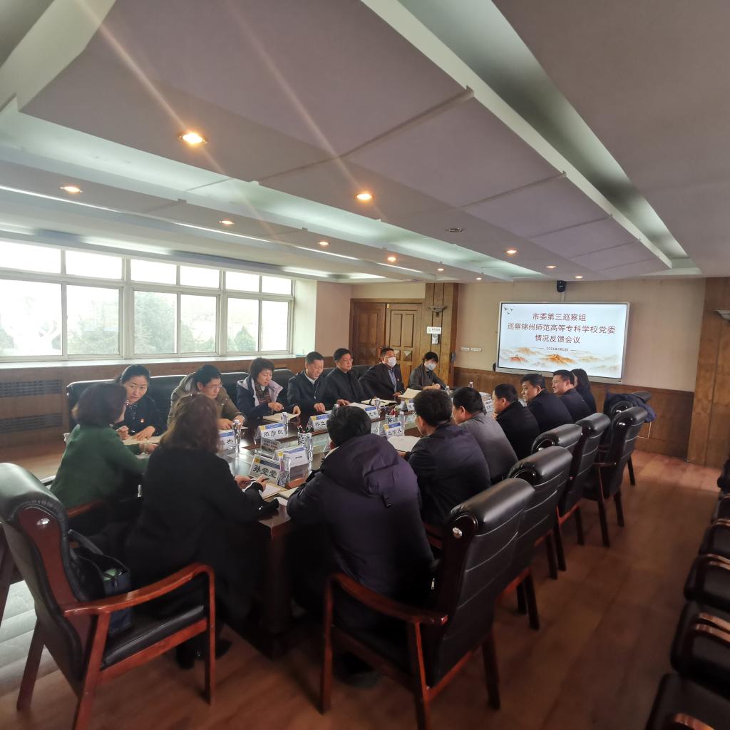 市委第三巡察组副组长廖传民、市教育局派驻纪检组组长杜晓光、市委组织部干部五科科长张高飞、市委组织部干部四科井一、市委第三巡察组水源、市委巡察办孙莹莹出席会议,锦州师专党委班子全体成员参加会议。