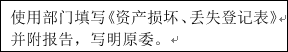 第二十一条  发现资产丢失时,应保护好现场,立即报告保卫处或上级有关部门。当事部门要填写《资产丢失登记表》。学校保卫处要迅速组织查明原因,提出处理意见,由当事部门将丢失清单和保卫处处理意见交给党政办公室(资产管理办公室)。