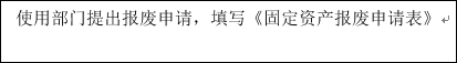 (二)计划报废的资产,管理部门提出报废申请,阐述报废理由,经有关领导和党政办公室(资产管理办公室)批准后,填写《资产报废申请表》,并由部门负责人、部门资产管理员签字,报党政办公室(资产管理办公室)