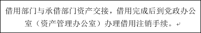 第十三条  因工作需要借用低值耐用设备时,借用部门要填写“设备借条”,并由借用部门的主管校长、部门负责人、管理员分别签字,报党政办公室(资产管理办公室)备案。在借用期间,设备由借入部门妥善保管,用完后及时归还。