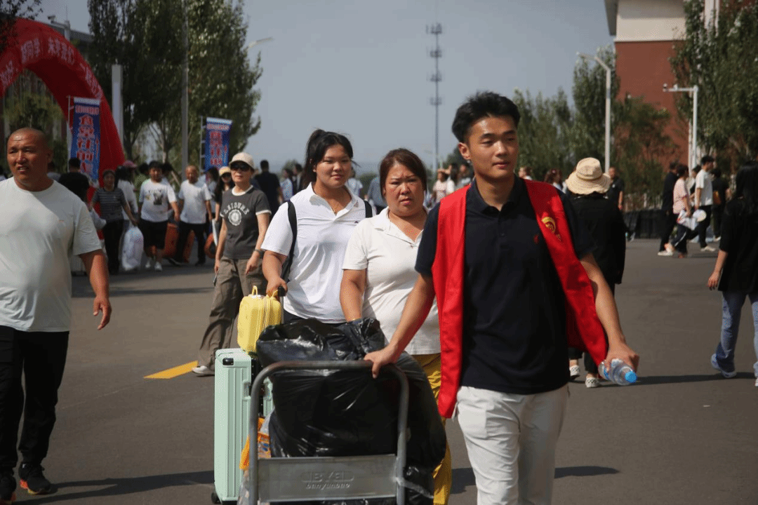 上百名"红马甲"昼夜值守,从车站接引到行李搬运,用脚步丈量温暖。当天学校组织志愿者在锦州站、锦州北站、锦州南站准时守候,全天待命为新生报到提供点对点保障。为迎接新生有序入校报到,学校设立了迎新引导点,配备迎新接站车,为新生提供“一站式”入学服务。