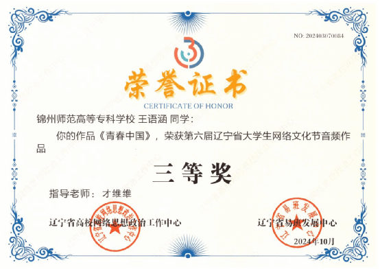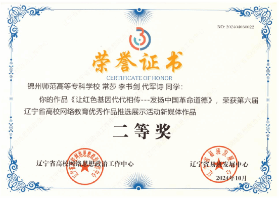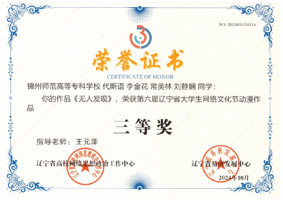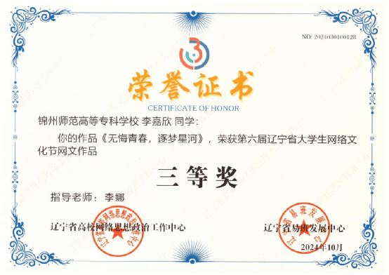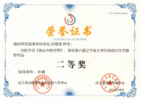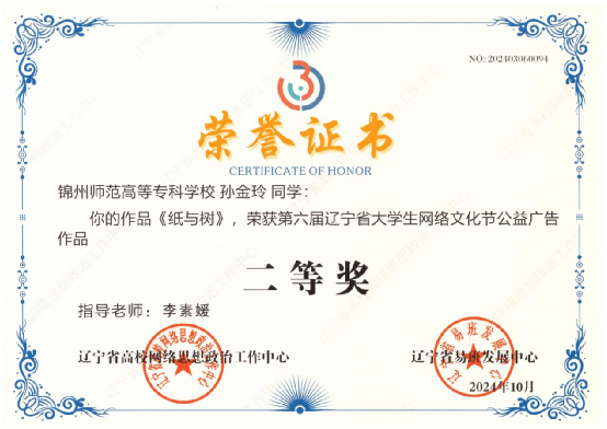 近日,参赛作品评选结果揭晓。我校学生共有五件作品在第六届辽宁省大学生网络文化节活动中获奖,其中李嘉欣的网文作品《无悔青春,逐梦星河》(指导教师:李娜)在网文赛道荣获三等奖,孙莺源的摄影作品《镜头中的世界》(指导教师:孙楠)在摄影赛道荣获二等奖,代斯语、李金花、常美林、刘静娴的动漫作品《无人发现》(指导教师:王元泽)在动漫赛道荣获三等奖,孙金玲的公益广告作品《纸与树》(指导教师:李素媛)在公益广告赛道荣获二等奖,王语涵的音频作品《青春中国》(指导教师:才维维)在音频赛道荣获三等奖。我校教师常莎、李书剑、代军诗的《让红色基因代代相传——发扬中国革命道德》在第六届辽宁省高校网络教育优秀作品推选展示活动中荣获优秀新媒体作品二等奖。