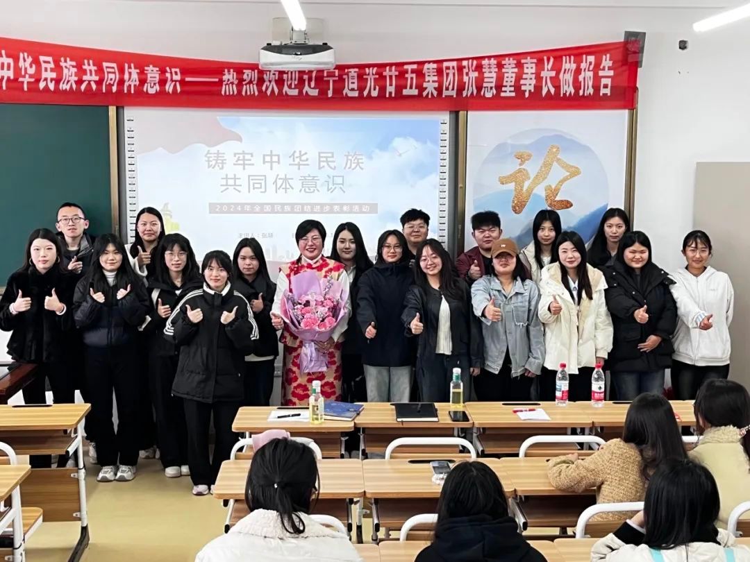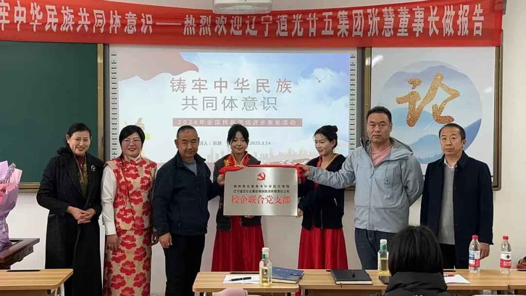 为深入学习贯彻习近平总书记关于加强和改进民族工作的重要思想,营造铸牢中华民族共同体意识教育的浓厚氛围,引导广大师生深入理解中华民族共同体的深刻内涵,培养同学们的爱国情怀、增强民族凝聚力。近日,我校在颂贤楼502教室举办铸牢中华民族共同体意识专题讲座,辽宁道光廿五集团董事长张慧女士作为特邀嘉宾,为师生带来了一场兼具理论深度与实践案例的精彩宣讲。我校党委书记、校长陈建军,副校长崔宝秋,锦州师专特聘研究员、东北大学东亚研究院辽西分院院长梁晓东出席活动,文学院领导与部分师生共同参加了此次活动。