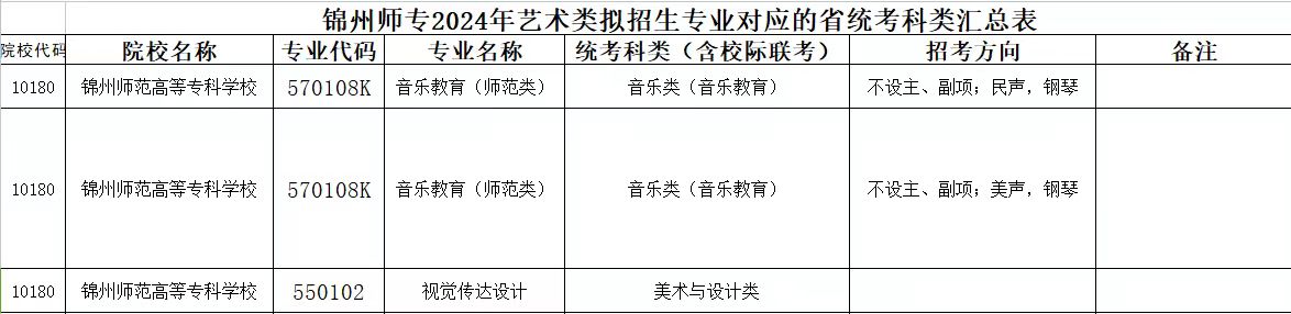 锦州师专2024年艺术类招生专业对应的省统考科类汇总表