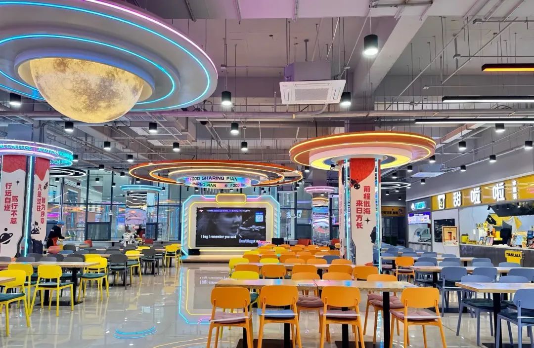 学校“网红”食堂突破传统餐饮功能,打造集用餐、文化活动、社交休闲于一体的校园地标。空间划分餐饮区、舞台活动区、休闲交流区三大板块:餐饮区提供家常菜系与风味小吃档口,许你不出校园就能吃遍天南海北;迷你舞台配备业余灯光音响设备,支持音乐演出、社团活动、即兴表演等多种形式的才艺展示,为师生提供随时可开启的创意绽放空间。休闲区设置卡座、多媒体屏及绿植景观,满足师生多元社交需求。