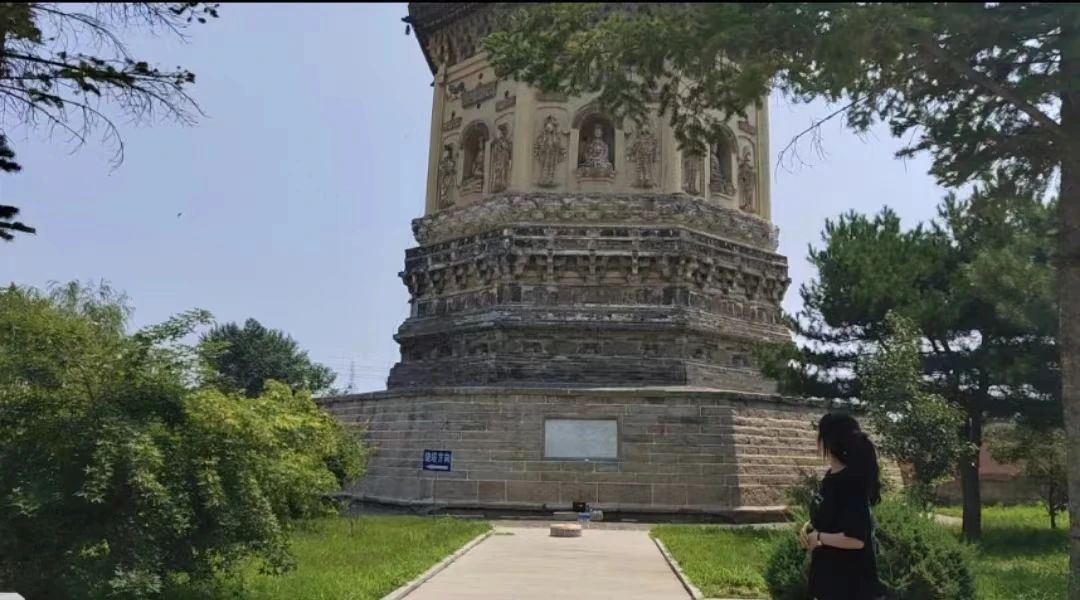 北镇双塔建造时期为辽代晚期,两塔东西相对,形制相同,均为砖筑实心八角十三层密严式塔,两塔之间相距、平均高度均为43米。塔共由塔座、塔身、塔檐、塔刹四部分组成,下方长条砖包砌的塔基是由明代辽东总兵官李成梁与其子为加固塔身而修建。此塔塔身共有八面,每一面雕有古龛,内雕坐佛,外立侍者,上有华盖。向上十三层塔檐逐渐内收,下层挂无数风铃,每层都有八角檐下坠有大风铎,风吹铃动,十分悦耳。北镇双塔之行使志愿者进一步了解了双塔历史,切身感受到了北镇深厚的文化底蕴,更加坚定文化自信。